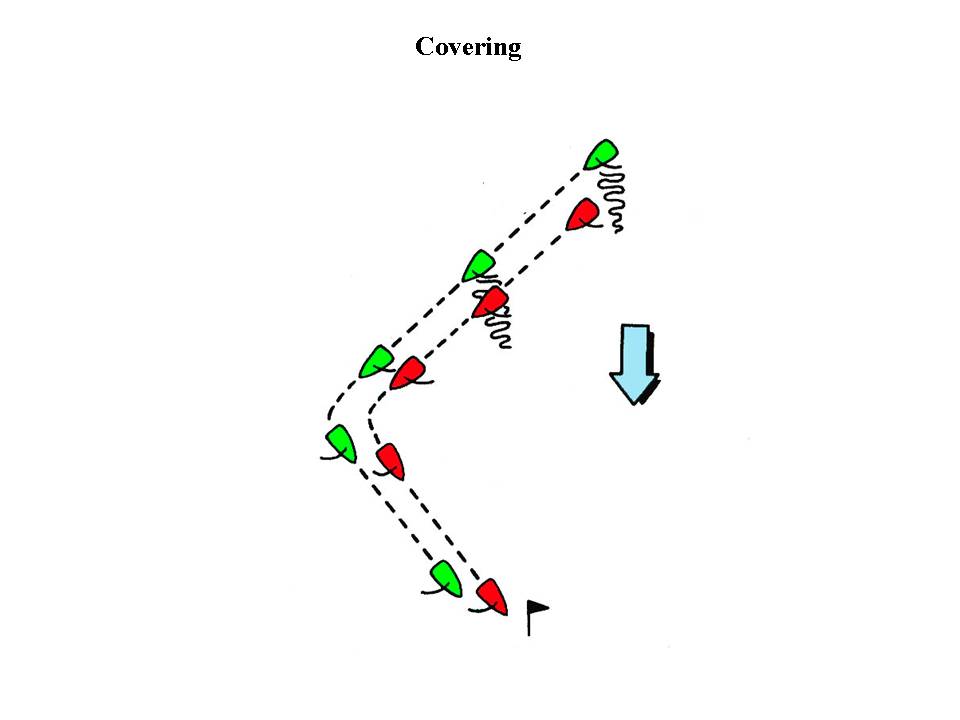 Here Red resorts to a cunning defense. She intentionally lets Green blanket her, being careful that Green doesn’t try to break for the inside. As they reach the lay line, Green is pinned on the outside, where she can only wait for Red to jibe and lead her to the mark. |
