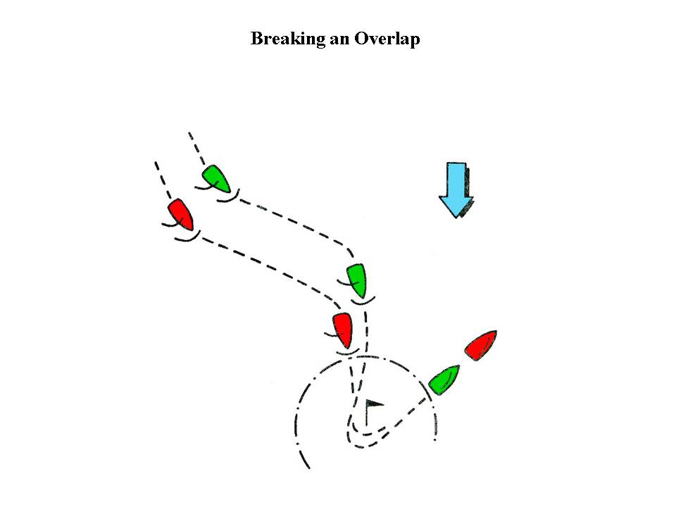 Red bears away sharply just before the 2 boat length circle to break Green’s overlap and force Green to round second.